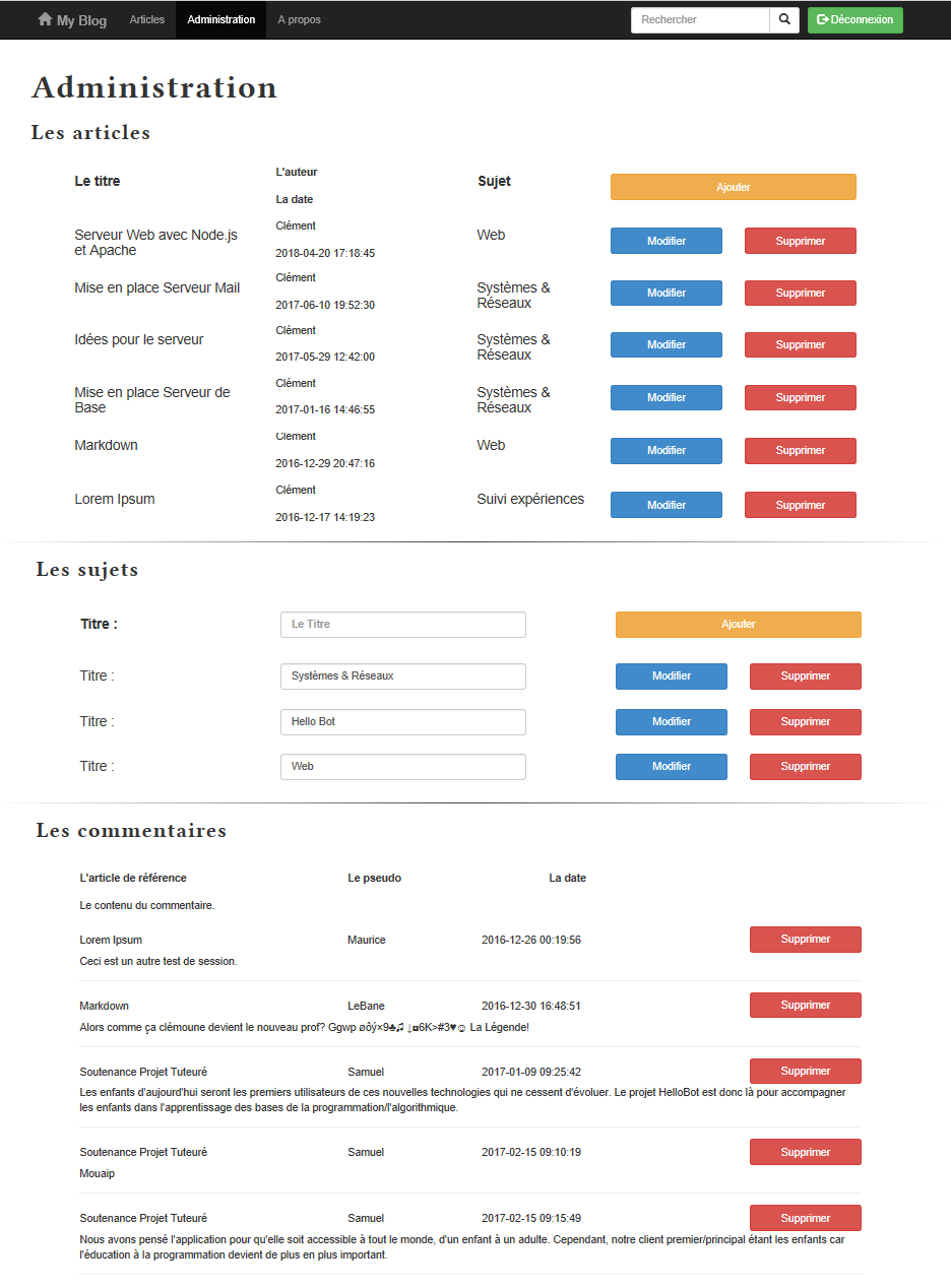 Le Panel administrateur permettant de ajouter/modifier/supprimer des articles ou des sujets, et de supprimer des commentaires d'utilisateurs, est de la forme :